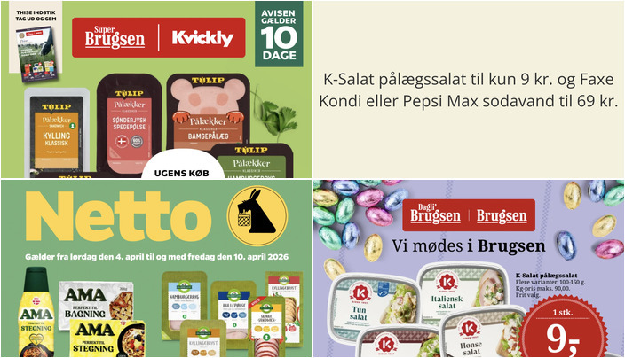 DagliBrugsen tilbyder et udvalg af K-Salat pålægssalater, herunder tun salat, italiensk salat, kylling & baconsalat og hønsesalat til kun 9 kr. pr. stk. Tilbuddet gælder fra torsdag den 2. april til torsdag den 9. april.