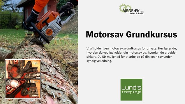 Praktisk informationDeltagerne opfordres til at medbringe deres egen motorsav og personligt sikkerhedsudstyr, som vil blive gennemgået under kurset. Der udleveres kursusmateriale, så der er ingen grund til at tage noter.